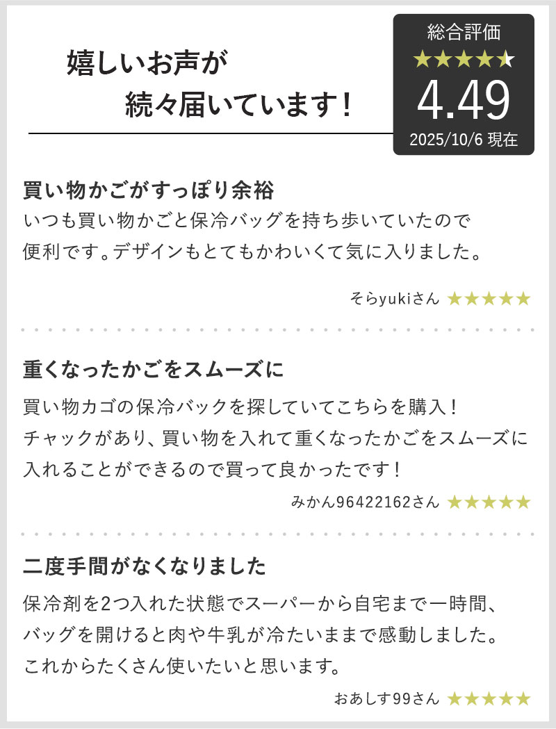 カゴごと保冷バッグに入れられるので、車に戻って別の保冷バッグへ詰め替えたりする手間はナシ。お家の冷蔵庫に運ぶまでひんやりをキープできるので、帰り道が渋滞していたり、途中で寄り道しても安心です。