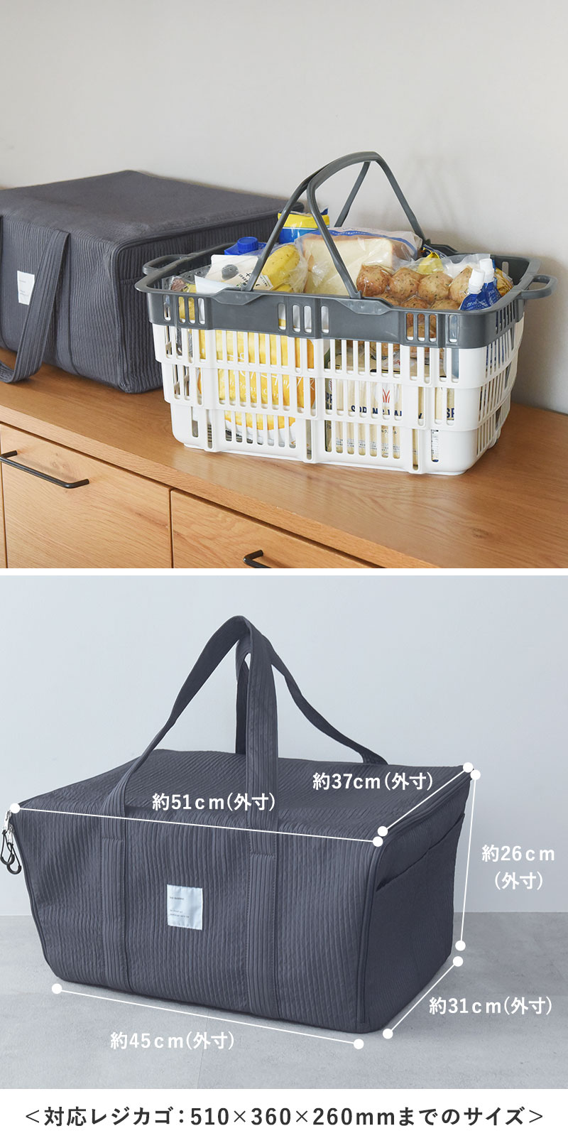 そんな時に活躍するのが、レジカゴごと入る保冷バッグ。裏地に保冷素材を使っているので一般的なエコバッグに比べて高い保冷力を持ち、全面ファスナーで開閉するので冷気をしっかり閉じ込めます。