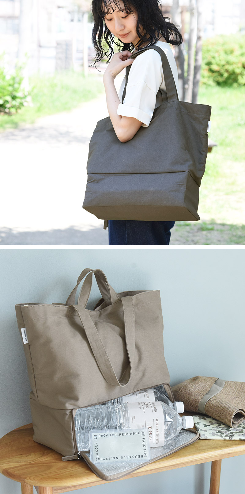 下層部分が保冷スペースになっていて、冷やしたい飲み物はそこにイン。そして他のアイテムは常温スペースへと分けながらも、まとめて持ち歩くことができるんです。これひとつで颯爽とお出かけ、バッグ複数持ち状態とおさらばできます。