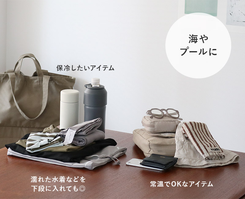 冷やしておきたいドリンクやお弁当などは下の保冷スペース、その他のタオルや着替えなどは上の常温スペースに、と分けられてバッグひとつで身軽にお出かけができます。