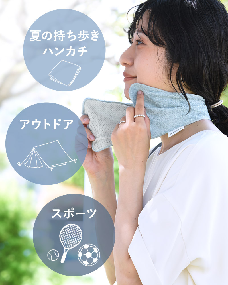 そのままでも涼やかですが、水で濡らすとヒンヤリ度がアップ。外出先でも冷たさをキープしてくれます。また、表面は日本製パイルで肌当たりも◎、ハンカチとしても優秀なアイテムです。