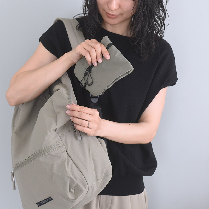 さらに、ベルトを外して左右のバックルを繋ぐと、ミニポーチに早変わり!腕にサッと通して持ち歩けます。
