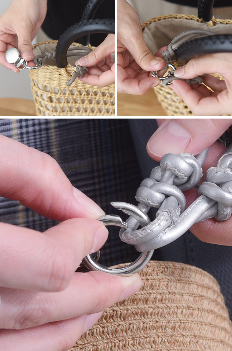 カバンの持ち手部分にくるっと巻いて、丸型のカラビナにストラップを通すだけ。力をかける必要もなく取り付け簡単です。