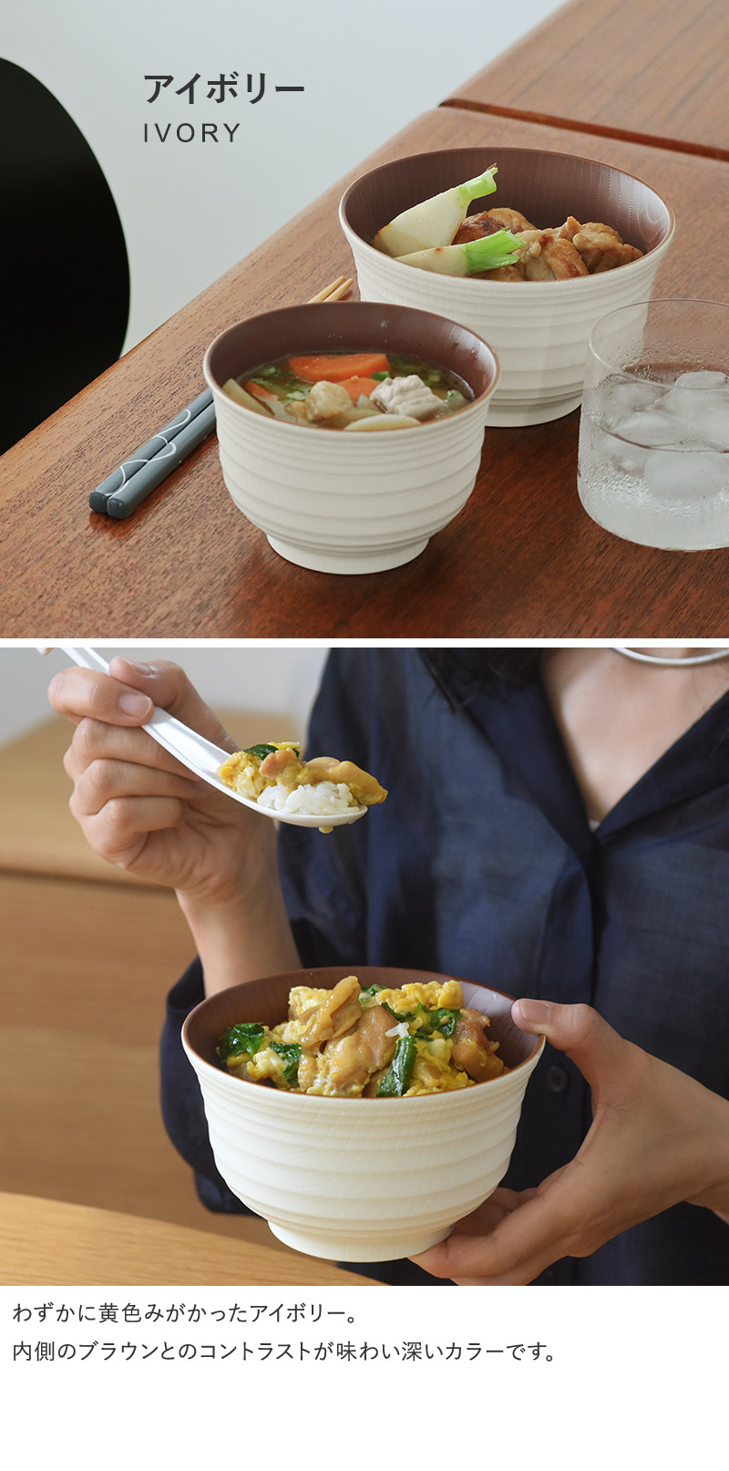 天然木のような温かみがある樹脂製のどんぶり。