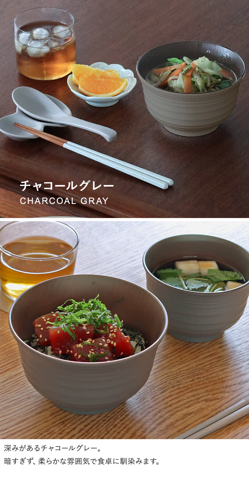 木目模様とつやを抑えたシックな風合いが、食卓に上質さを添えてくれます。シンプルなデザインなので、陶器やステンレスなど、質感が異なる器と並べて使うのも◎。