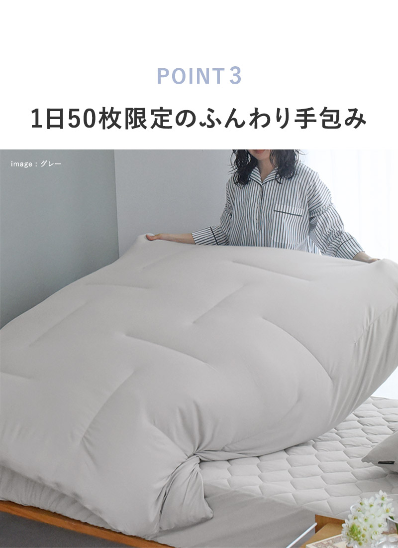 かけ心地の良さを最大限に感じるには、布団カバーを掛けずに、そのままお使いいただくのが◎。ふんわりと雲に包まれるような心地よさをお楽しみください。
