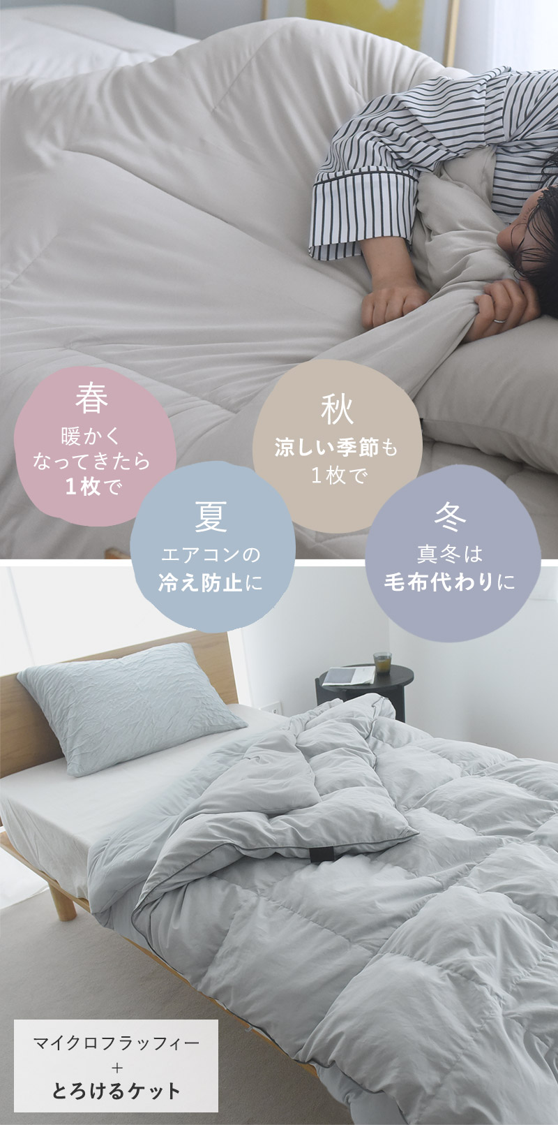 春・秋は1枚で、クーラーを使用して就寝する夏は肌掛け布団として、冬は羽毛布団や毛布と組み合わせてなど、年中無休お使いいただけます。