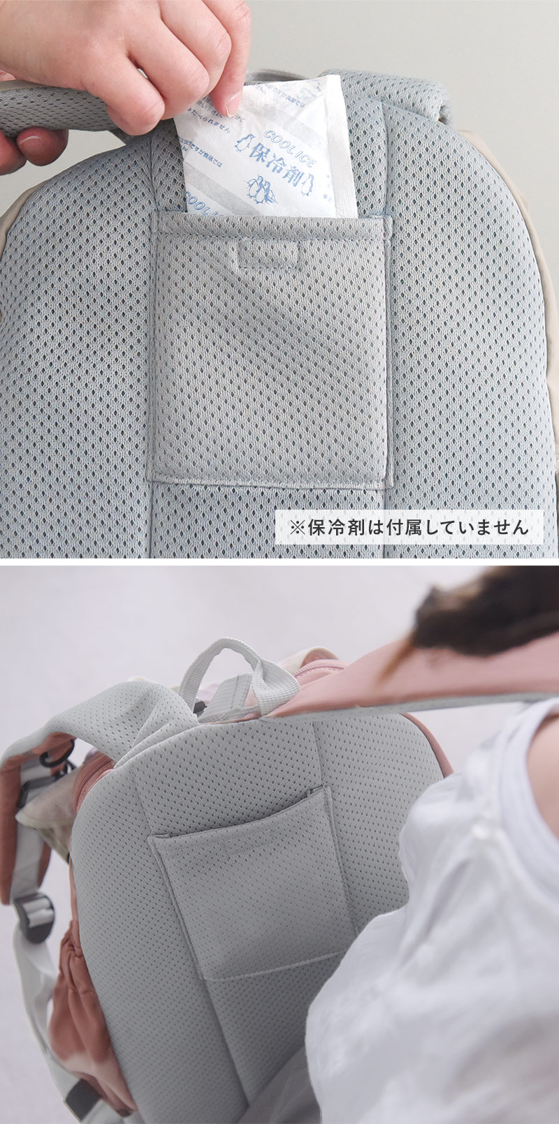 背面には保冷剤ポケットを付けて冷感をプラスできる仕様に。汗ばむ夏も快適に過ごせます。
