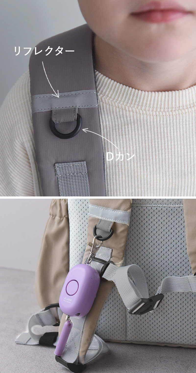 リュックの正面とショルダーにリフレクターが付いているので、夜道も安心。また右側のショルダーと外側ポケットには、防犯ブザーやキーケース、リフレクターを吊るせるDカンも付いています。