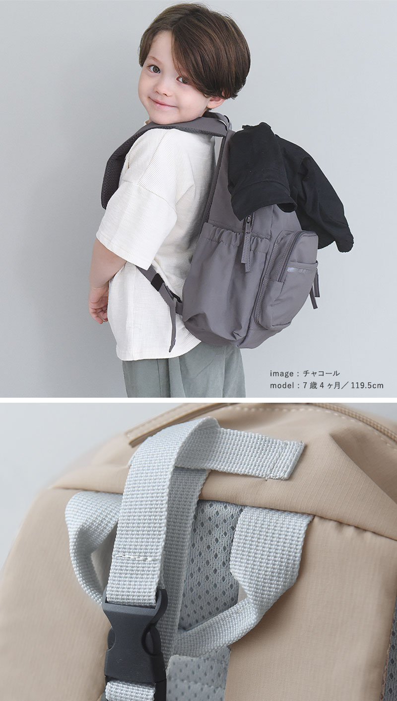 調節ベルトはまとめてすっきり未就学児~低学年まで成長に合わせて使えるように、ショルダーの調節ベルトは長めに設計。