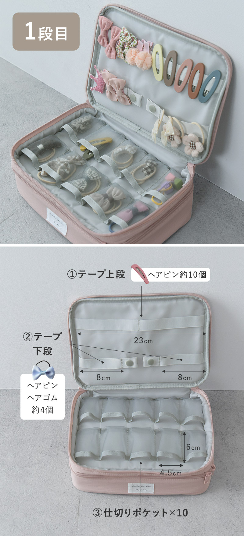 ヘアゴムにシュシュ、ヘアピンなど様々なアクセ類が収納しやすいように工夫した2段構造タイプ。何がしまってあるのかキッズたちも一目で分かりやすいよう、メッシュ素材を採用しています。