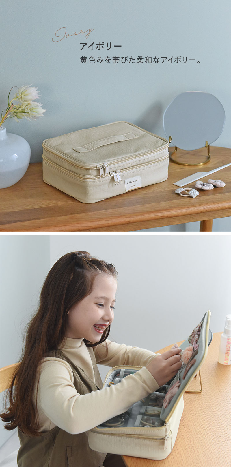 ご好評いただいているキッズのヘアアクセボックスに、新色アイボリーが登場しました。柔和な印象のアイボリーは、未就学からお姉さんになった高学年、また大人も使えるシンプルカラーです。
