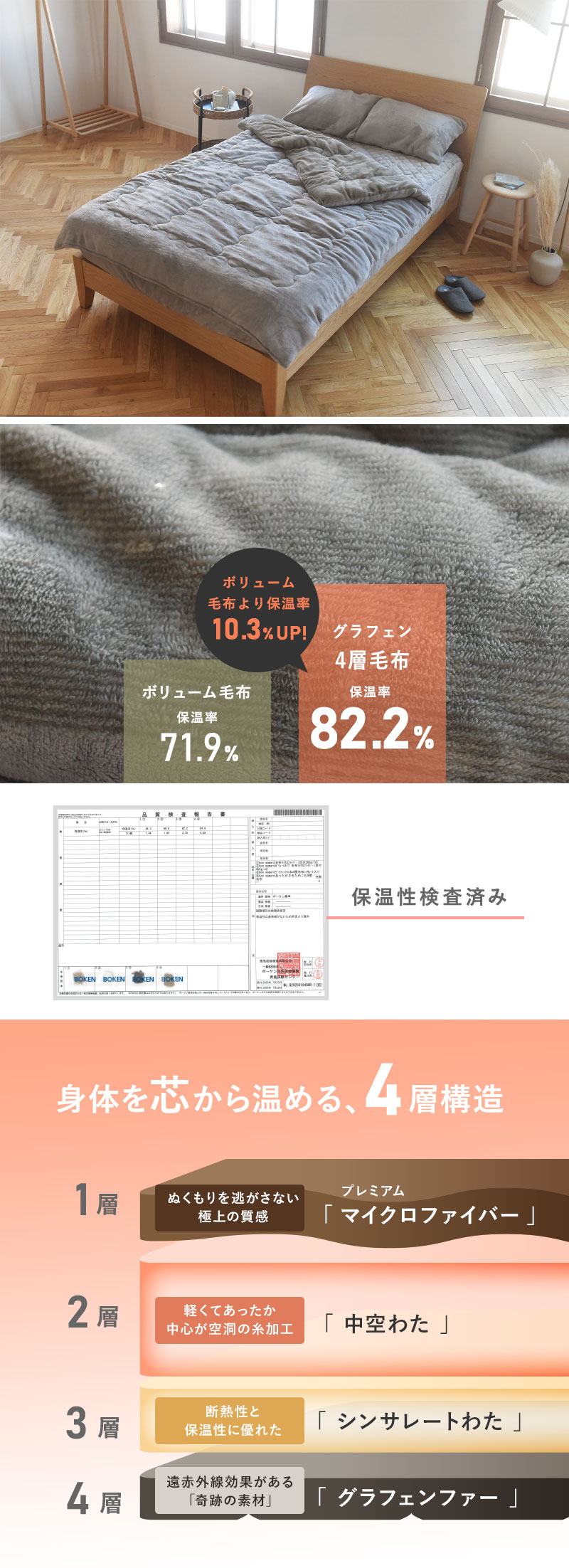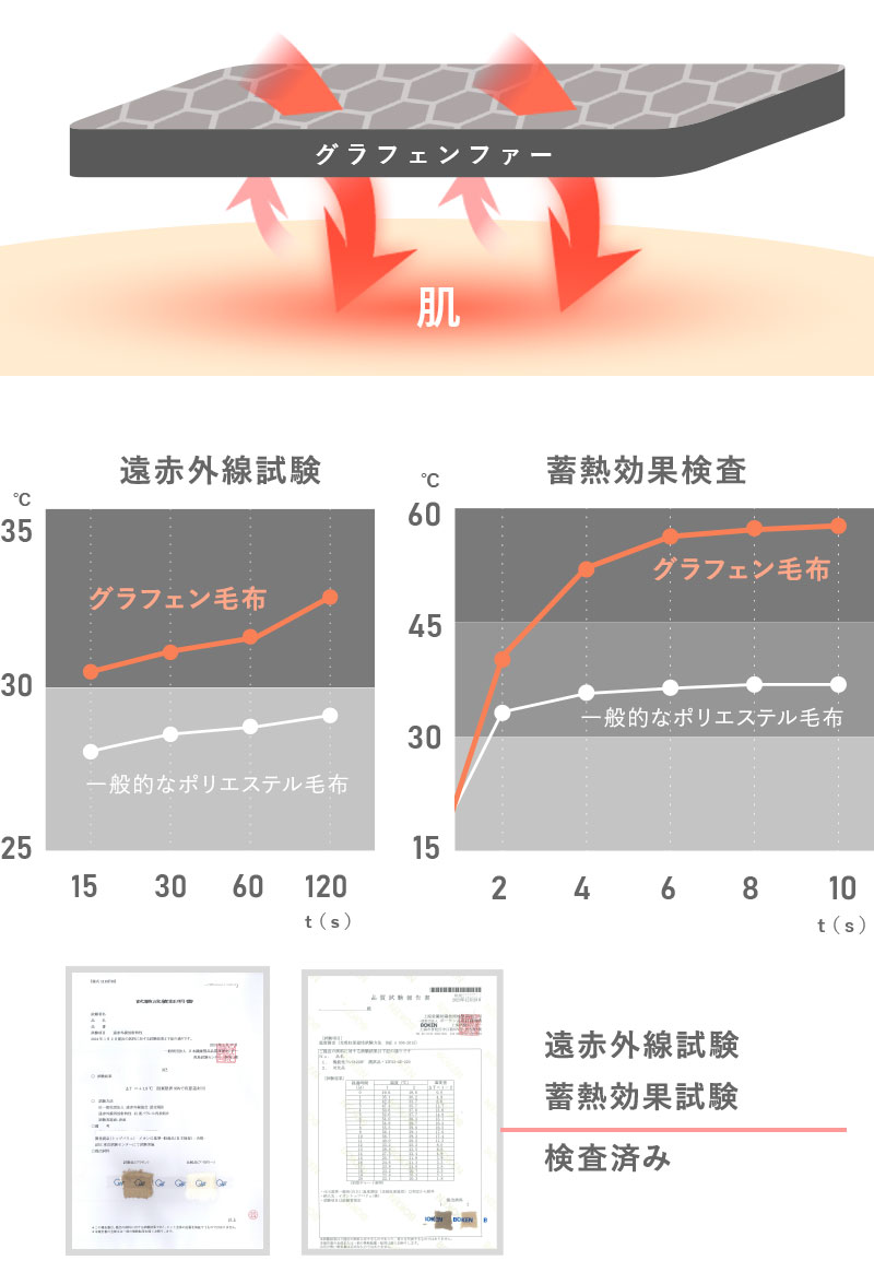 表面にはシフォンファー加工を施したプレミアムマイクロファイバー、裏面にはグラフェンを毛羽に練りこんだグラフェンファーを採用。ふわっと柔らかであたたかい4層仕立てです。