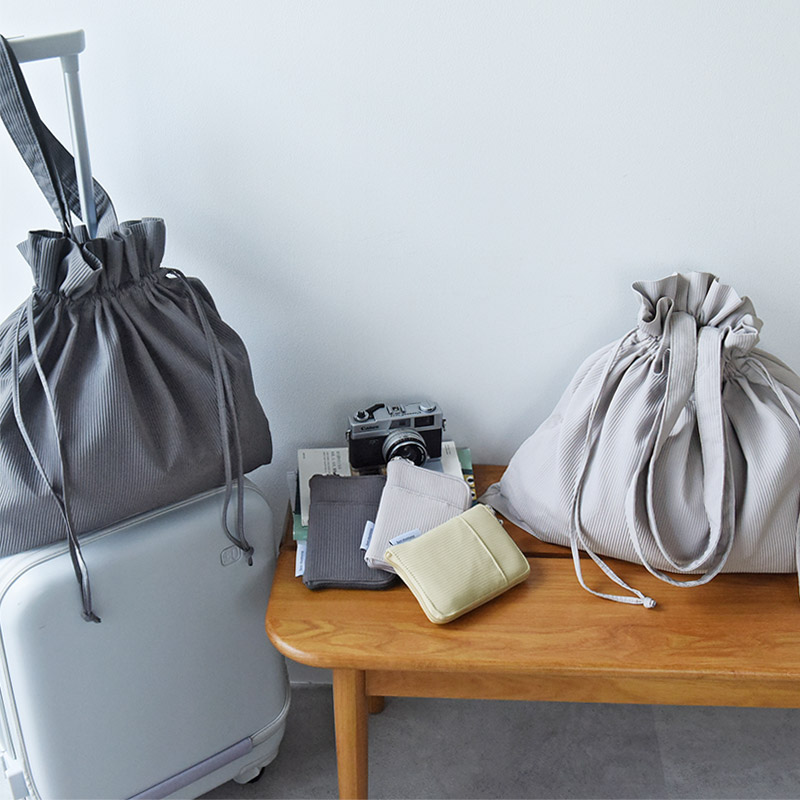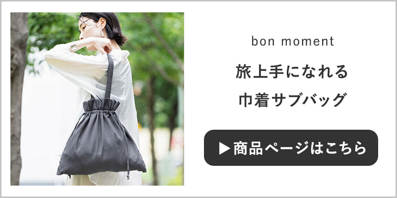 表地はさらっとしたストライプ生地。同じbon moment(ボンモマン)ブランドの「旅上手になれる巾着サブバッグ」のストライプタイプと同じ素材を使っているので、セットで使えば統一感UP。旅行気分を盛り上げてくれます。