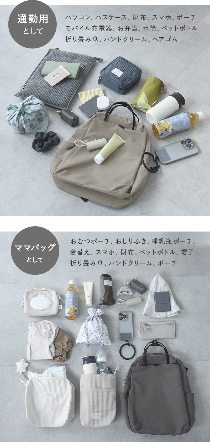通勤バッグとしてはもちろん、子どものグッズを持ち歩くママバッグとしても便利です。