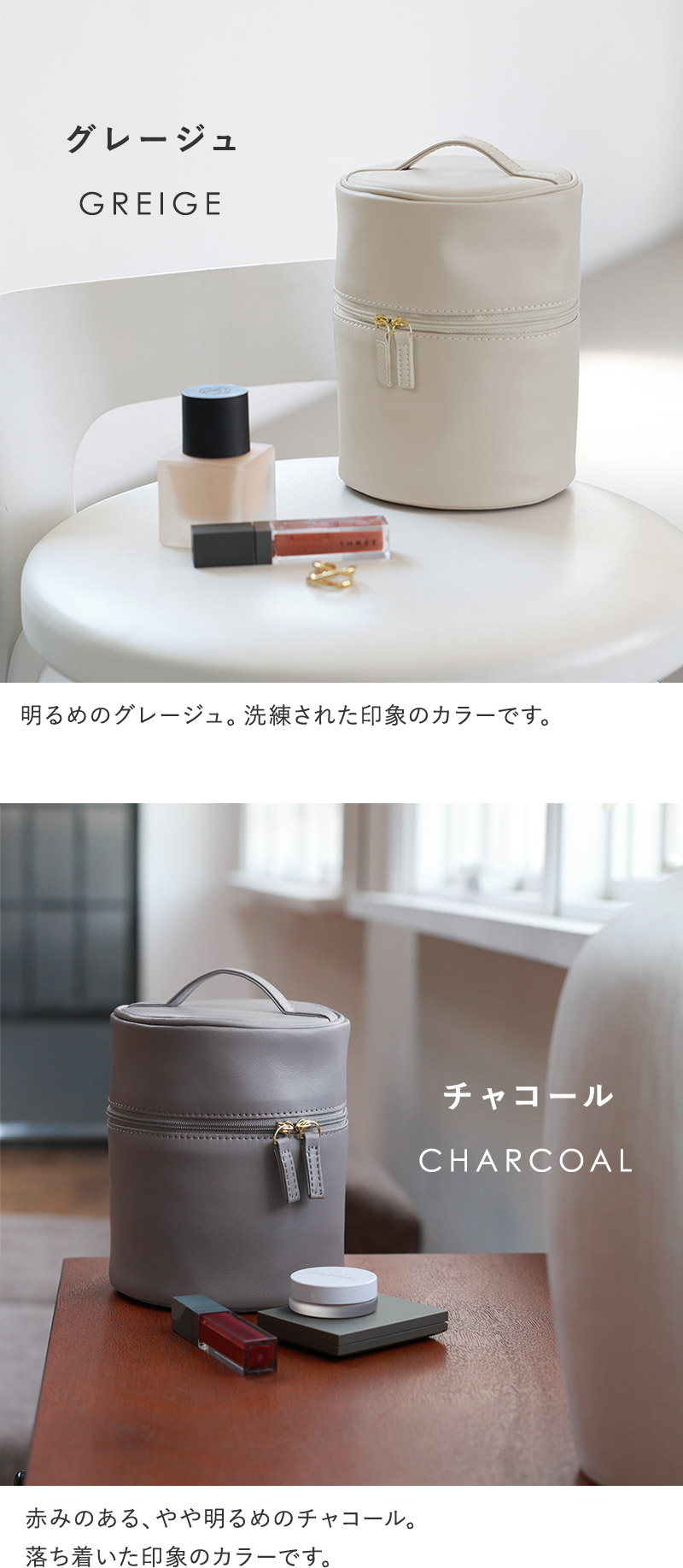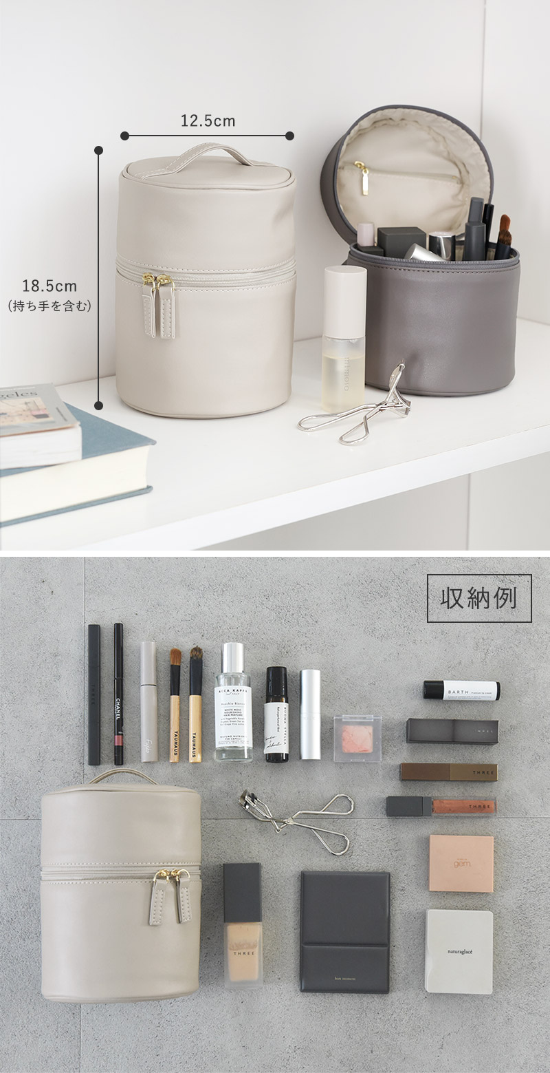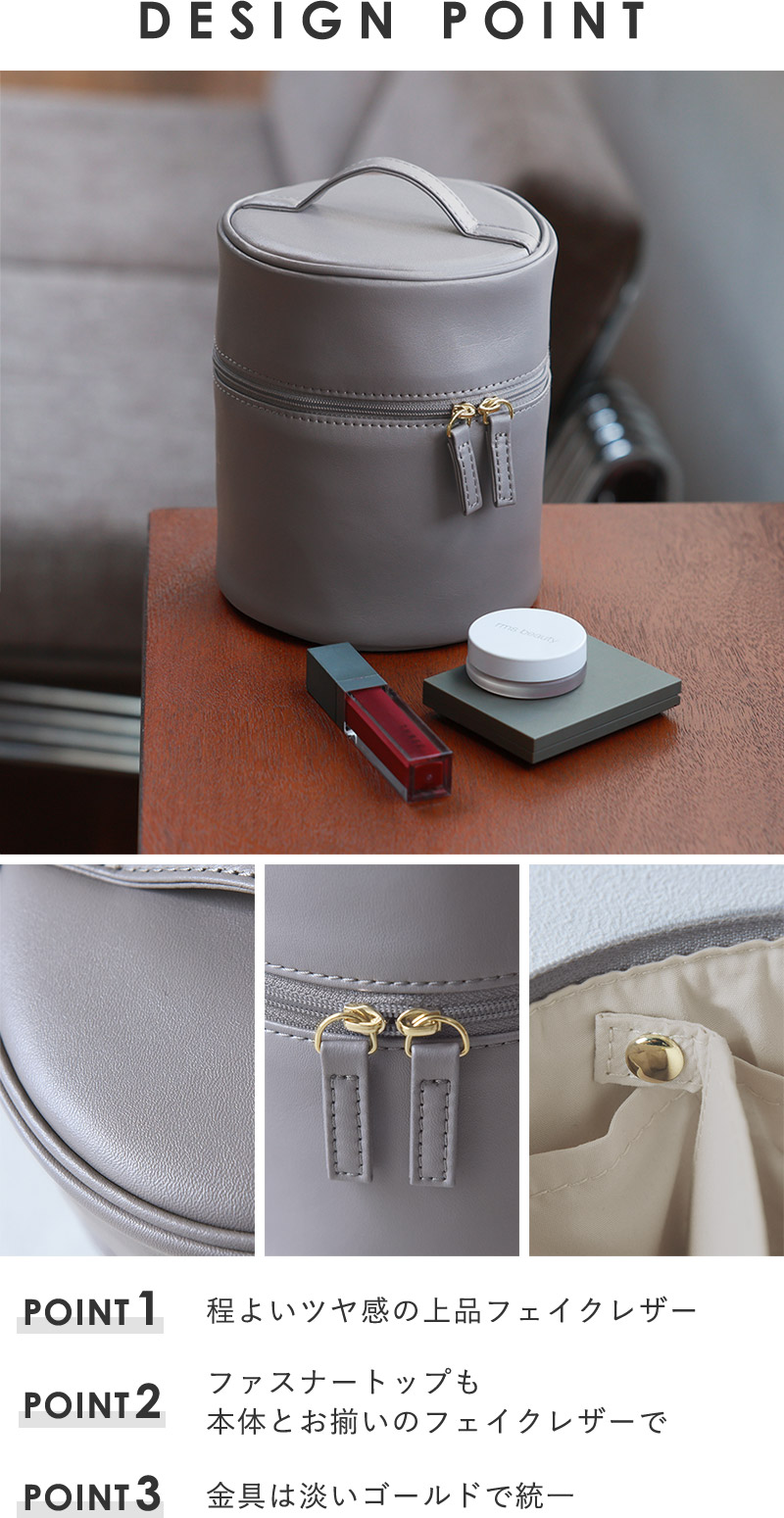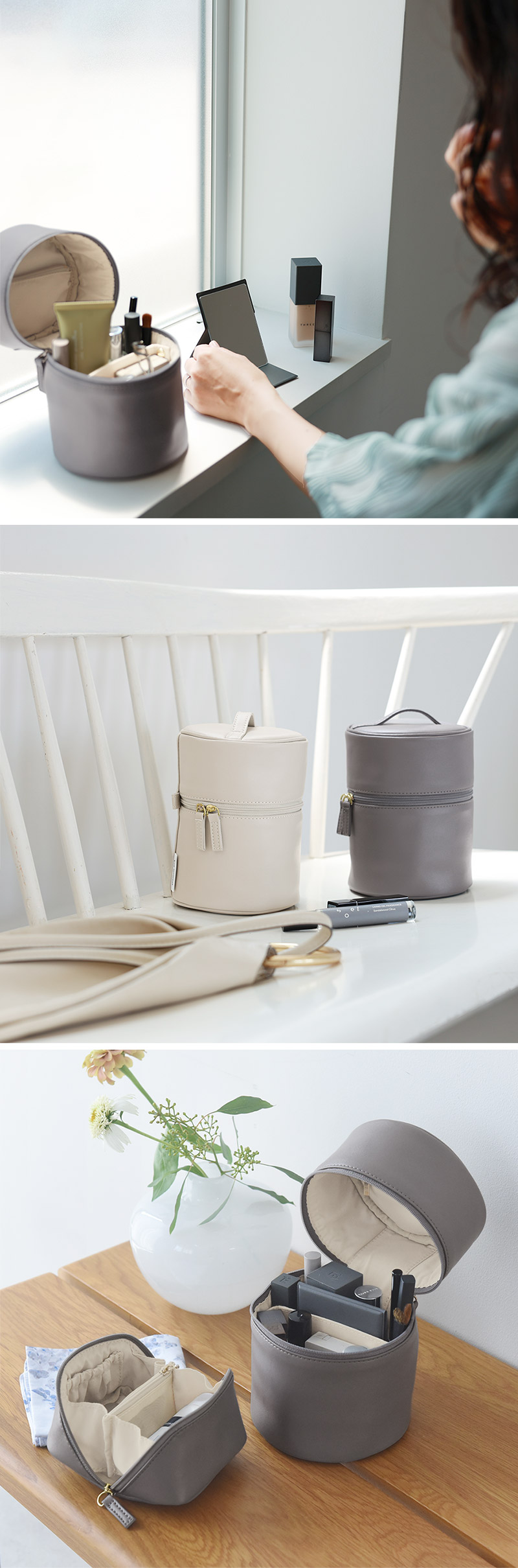 一軍コスメがすっきり整う、ラウンド型のミニバニティ。控えめなツヤが上品なフェイクレザータイプで、お部屋にそのまま置いておいても絵になる佇まいです。