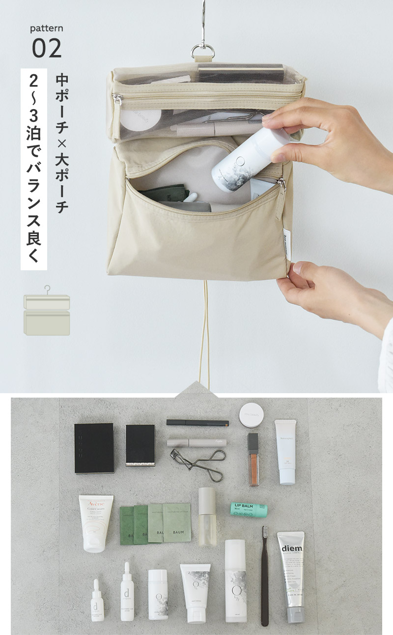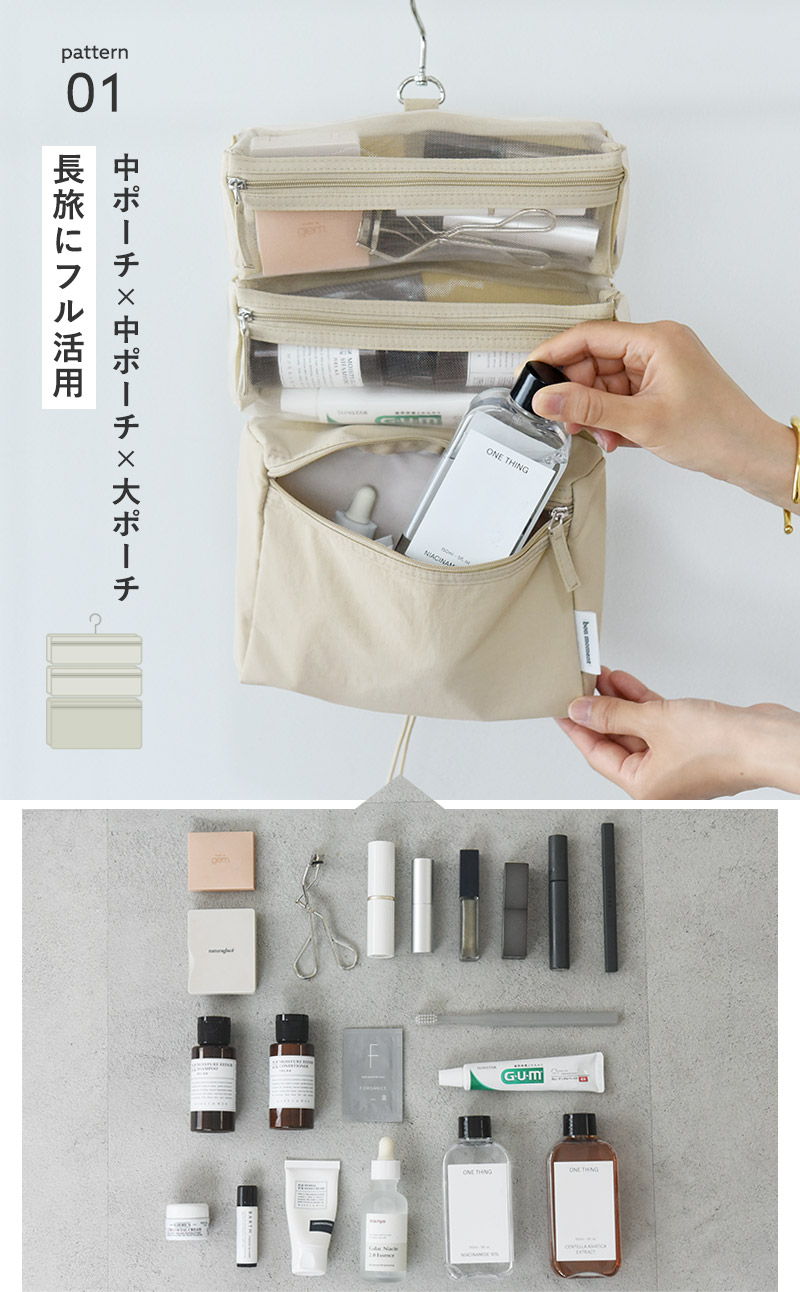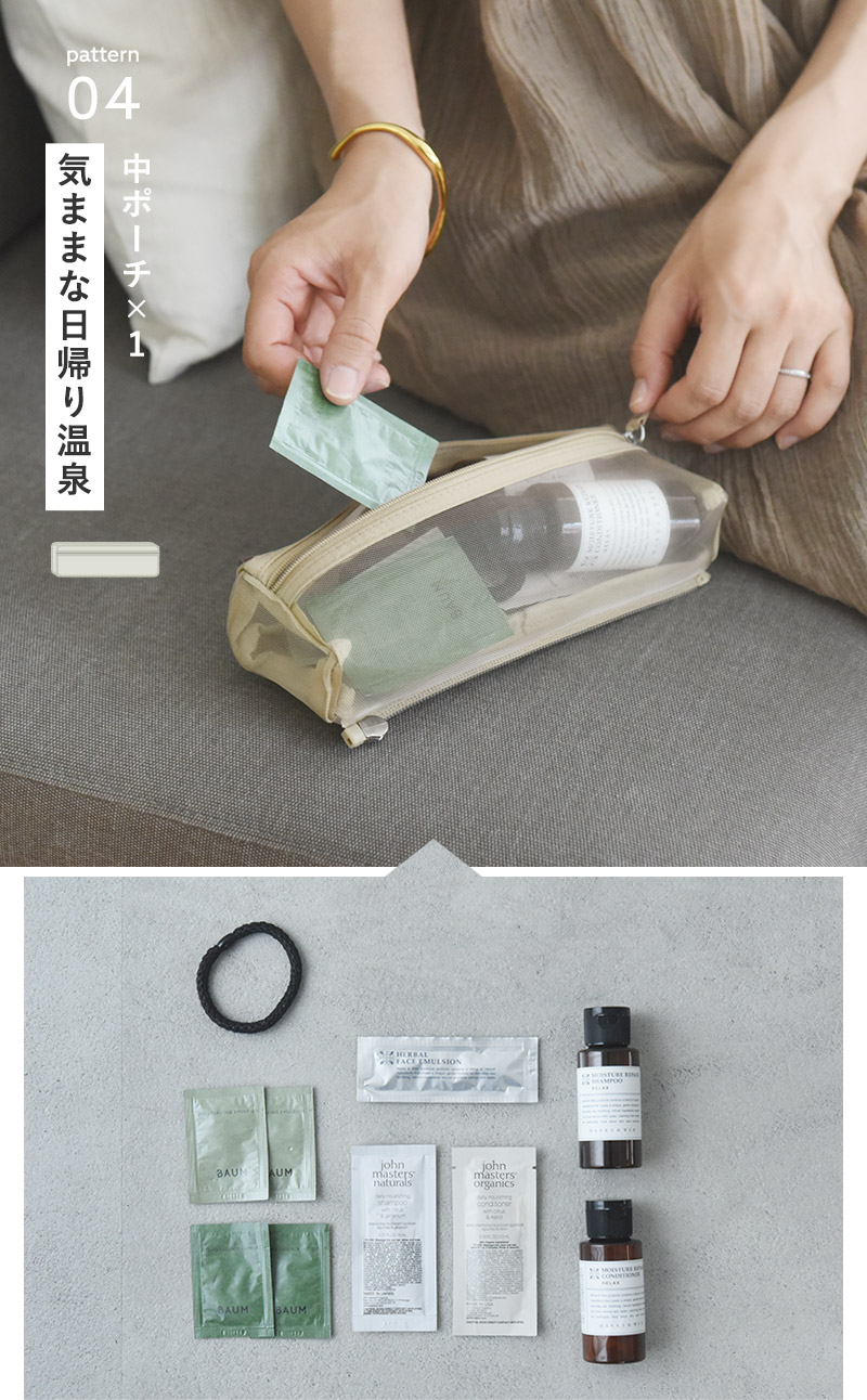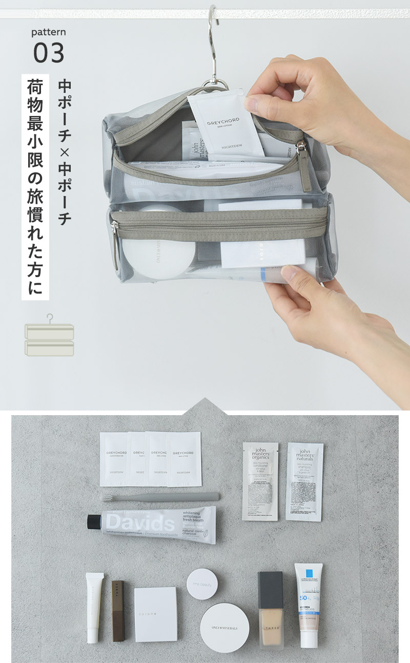 ヘアケア、マウスケア、基礎化粧品、化粧品をバランス良くコンパクトに持っていきたい時は、メッシュポーチをひとつ外してどうぞ。