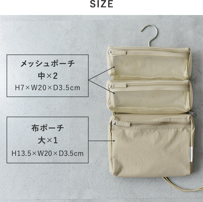 中サイズのポーチ2つは中が見やすいメッシュ素材。多少の水跳ねはOKなので、脱衣所や洗面台周りで使うものを入れるのにぴったりです。通気性がよく中身が乾きやすいのも◎。