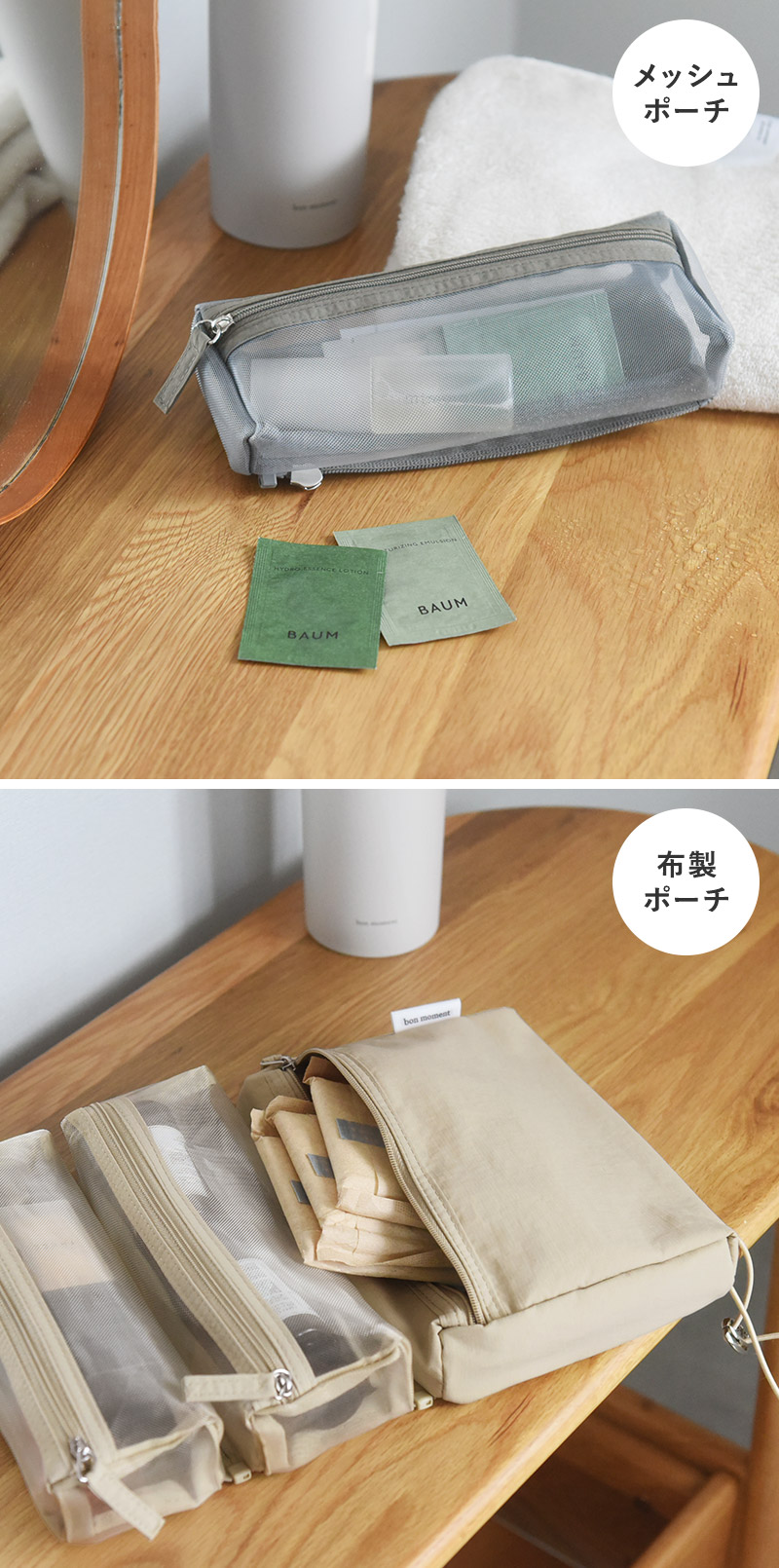 メッシュポーチにそれぞれメイク用品、お風呂セットを入れて。大きなポーチに基礎化粧品をボトルごと入れても。