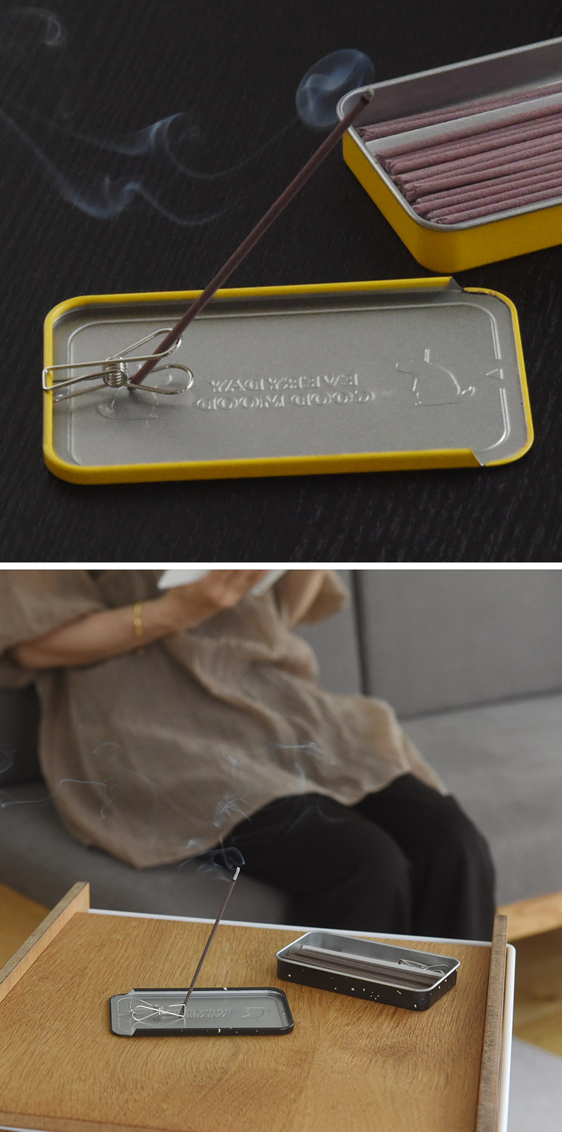 缶の蓋はスライドして取り外すことができて、裏返せばお香トレーに変身。また、お香立てとして使えるクリップも2つ入っています。これひとつで手軽にお香が楽しめる、オールインワンセットです。