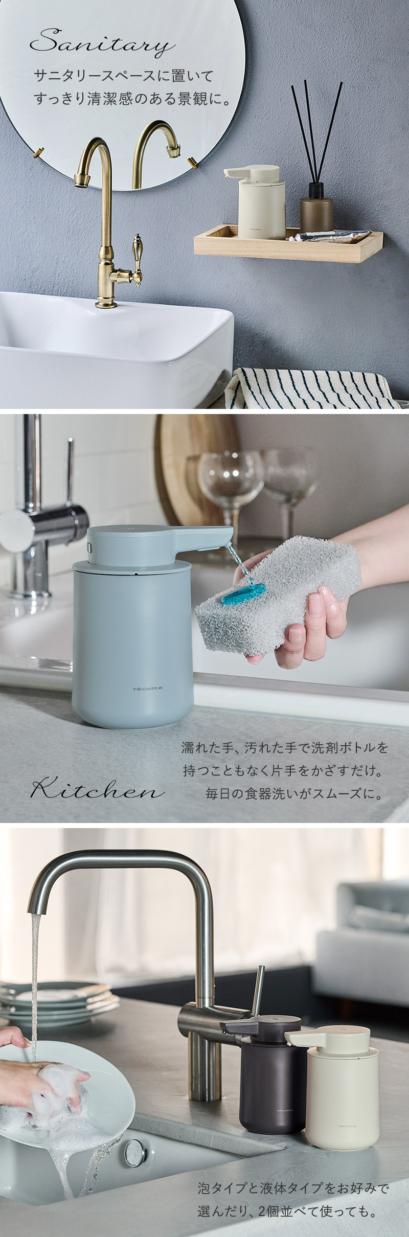 充電式オートディスペンサー/ソープディスペンサー 自動 泡 液体 ハンドソープディスペンサー 食器用洗剤/レコルト