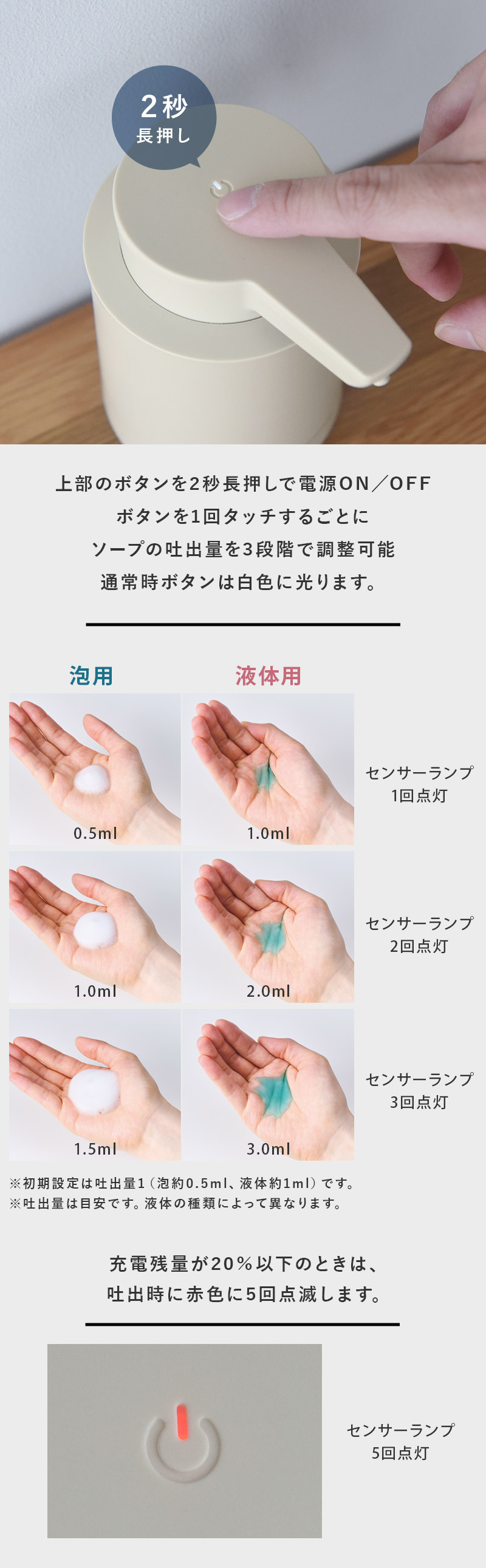 ※吐出量泡は0.5ml、液体は1mlで1日10回の使用を想定。ただし、バッテリーの特性を考慮し、6ヶ月に1回の充電を推奨。