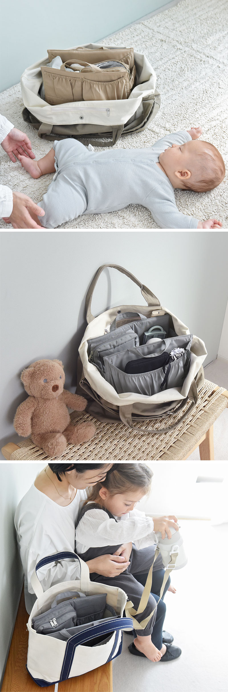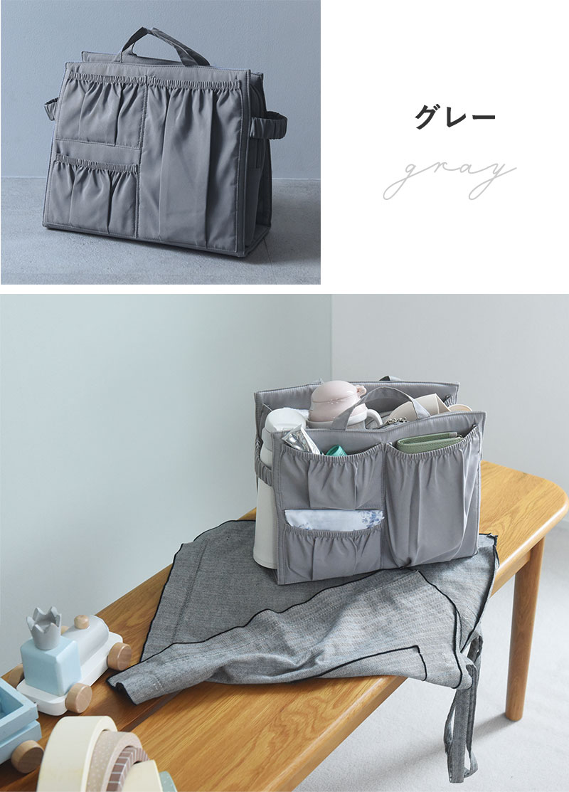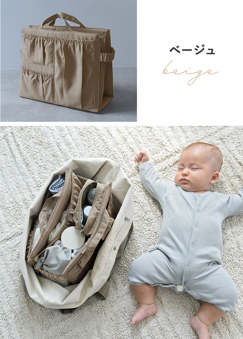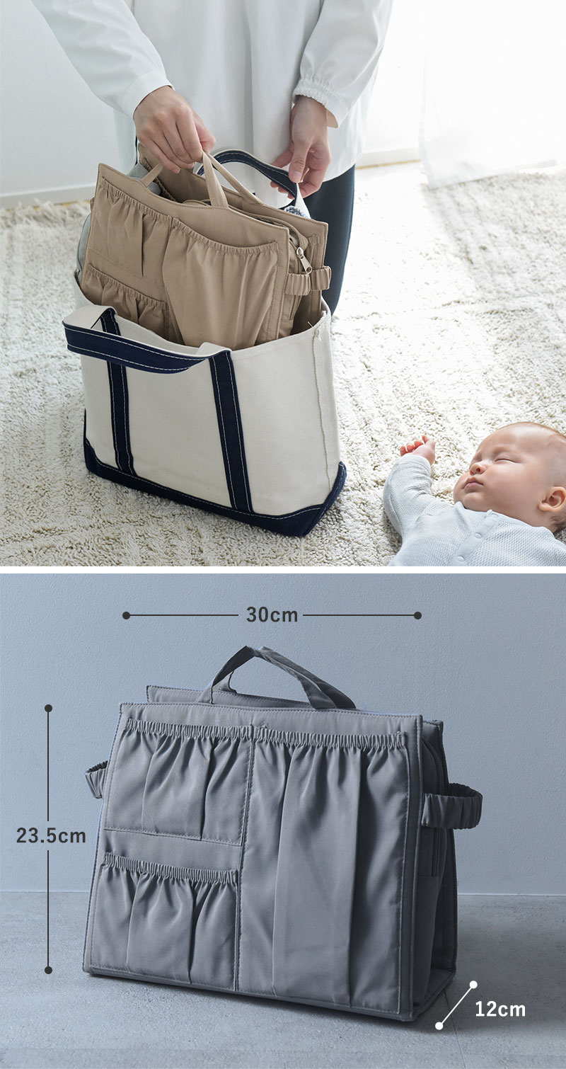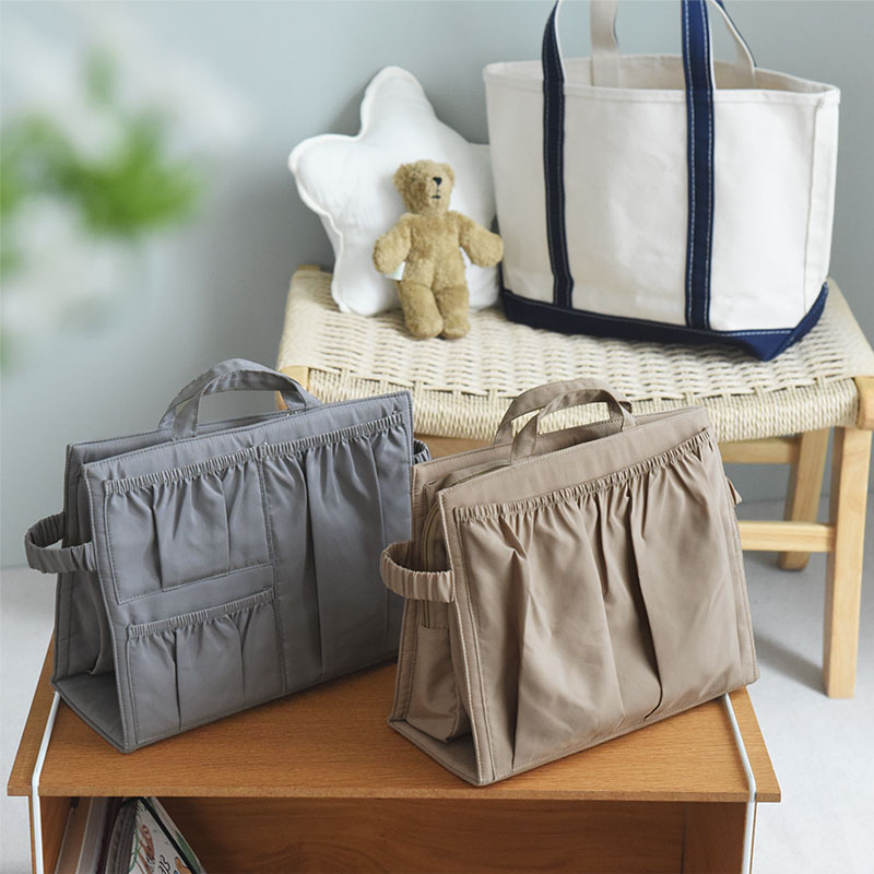 お出かけには収納に特化したマザーズバッグが便利だけど、お気に入りのトートも活用したい。そんな時にお役立ち、お手持ちのバッグにすぽっと入れられる「バッグインバッグ」です。