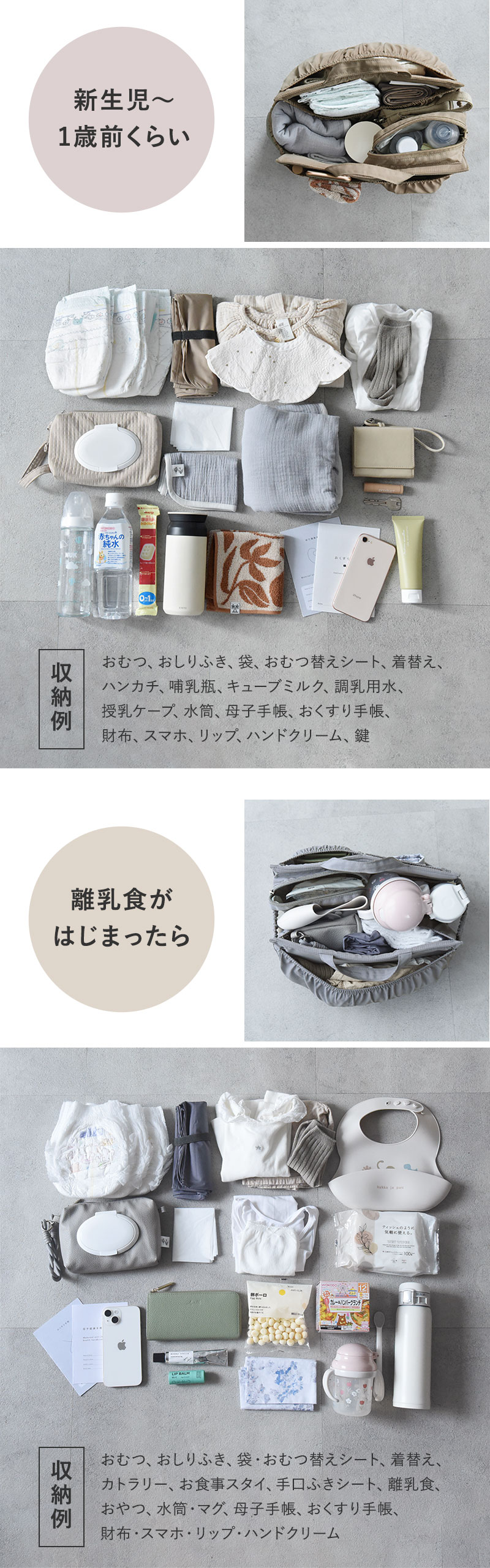 ベビーとのお出かけセットをひとまとめにできるだけでなく、ごちゃつきがちなアイテムをさっと取り出せるように、「何がどこにあるか」一目で分かりやすい作りにこだわりました。