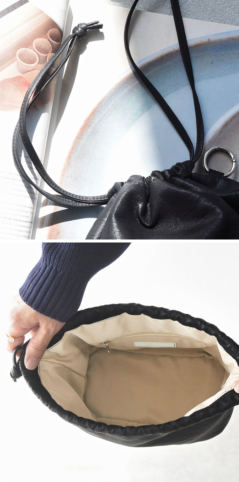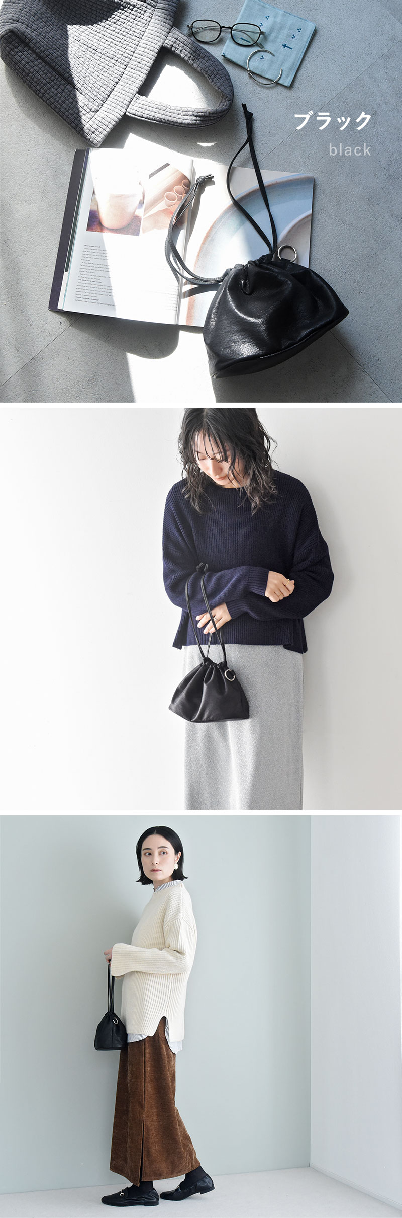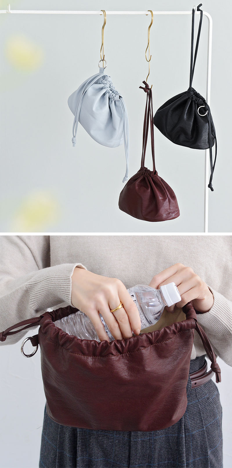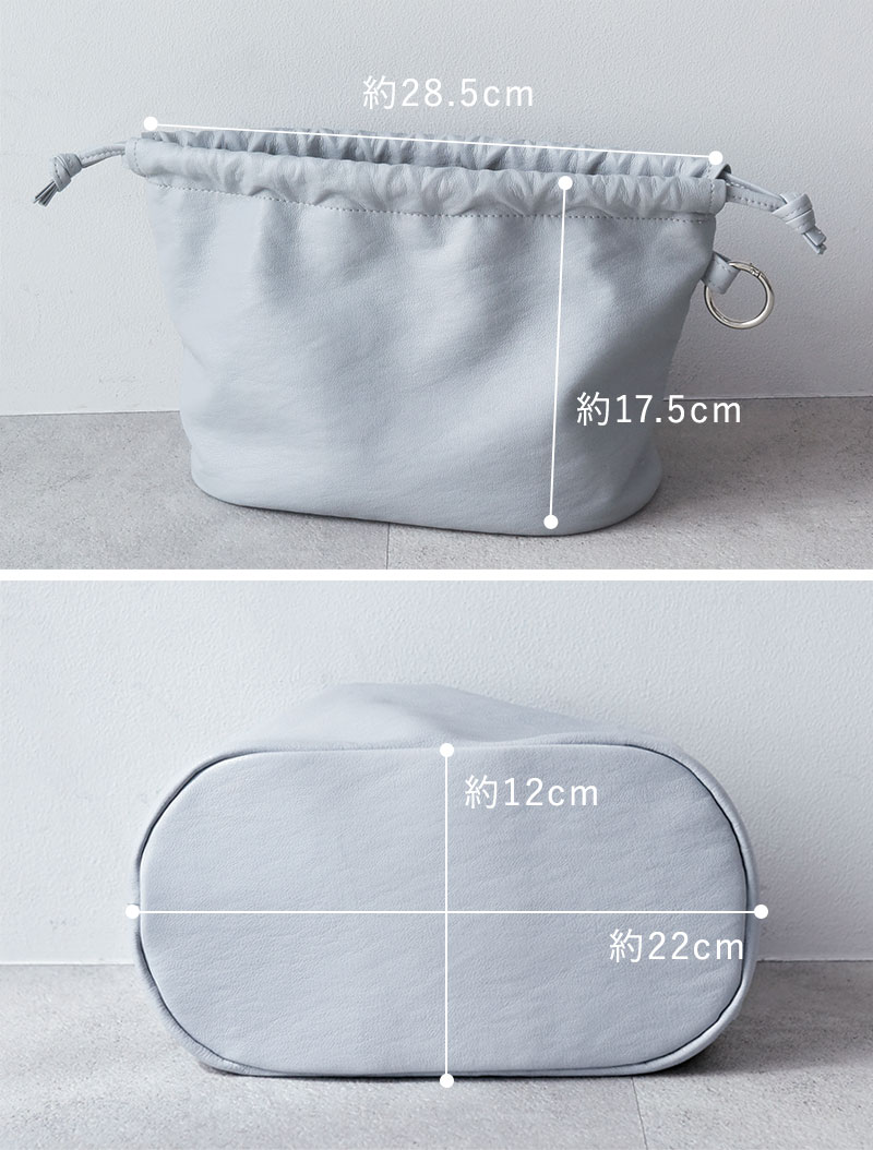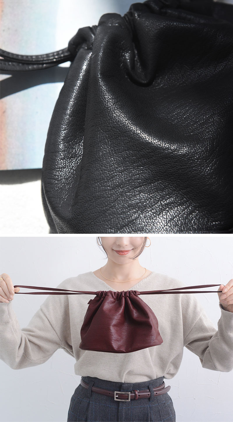 くたっと柔らかく手に馴染む、フェイクレザー素材の巾着ポーチ。バッグインバッグとして小物を整頓したり、トートバッグの目隠しにしたり。そのまま持って巾着バッグとしても使える上品な印象に仕上げました。