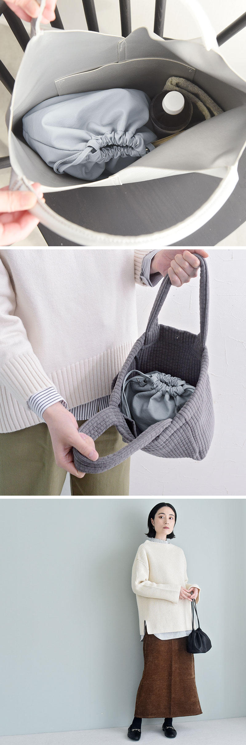 本体と同じ素材を使った巾着の紐は、細めにすることでポーチとしても使いやすくなっています。