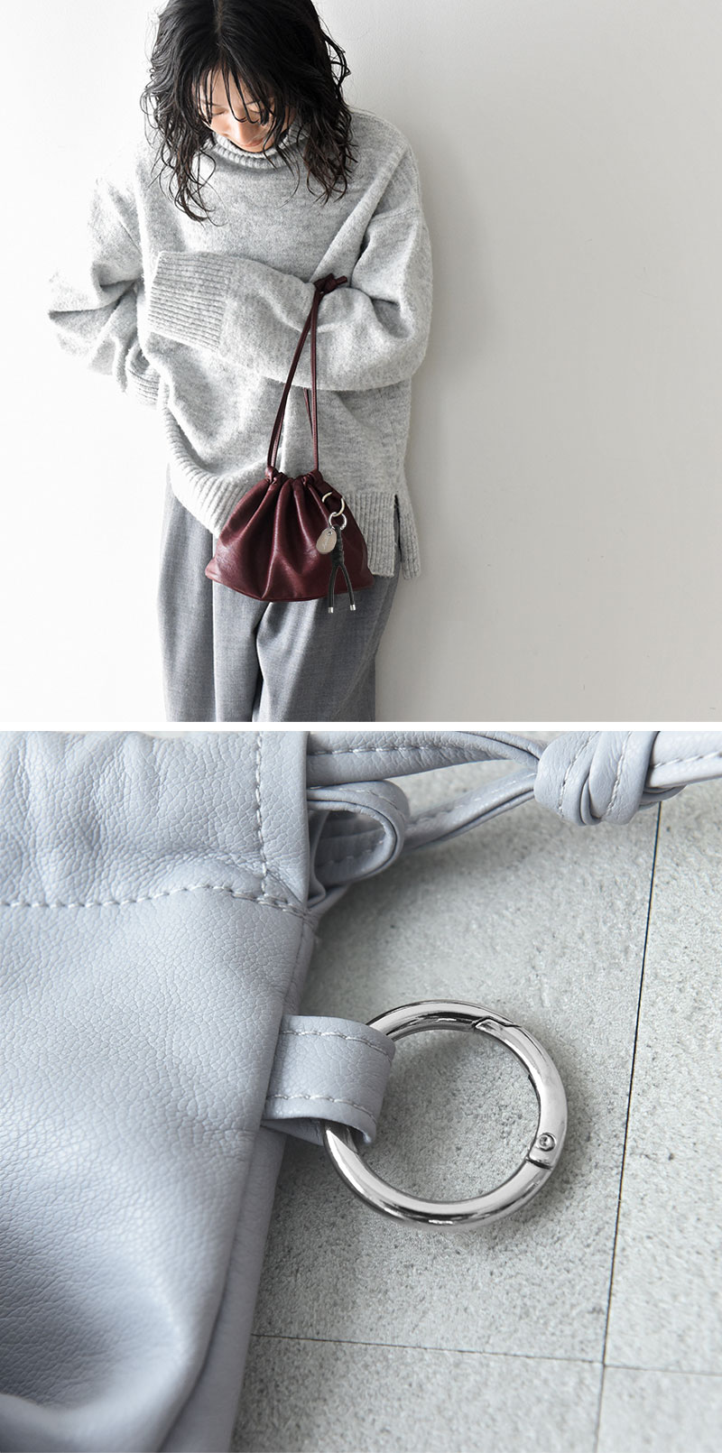 サイドにシルバーのカラビナリングを付けたので、お気に入りのチャームを付ければ、自分だけの巾着ポーチに◎。何もつけなくても、シルバーリングがデザインのアクセントになってくれます。