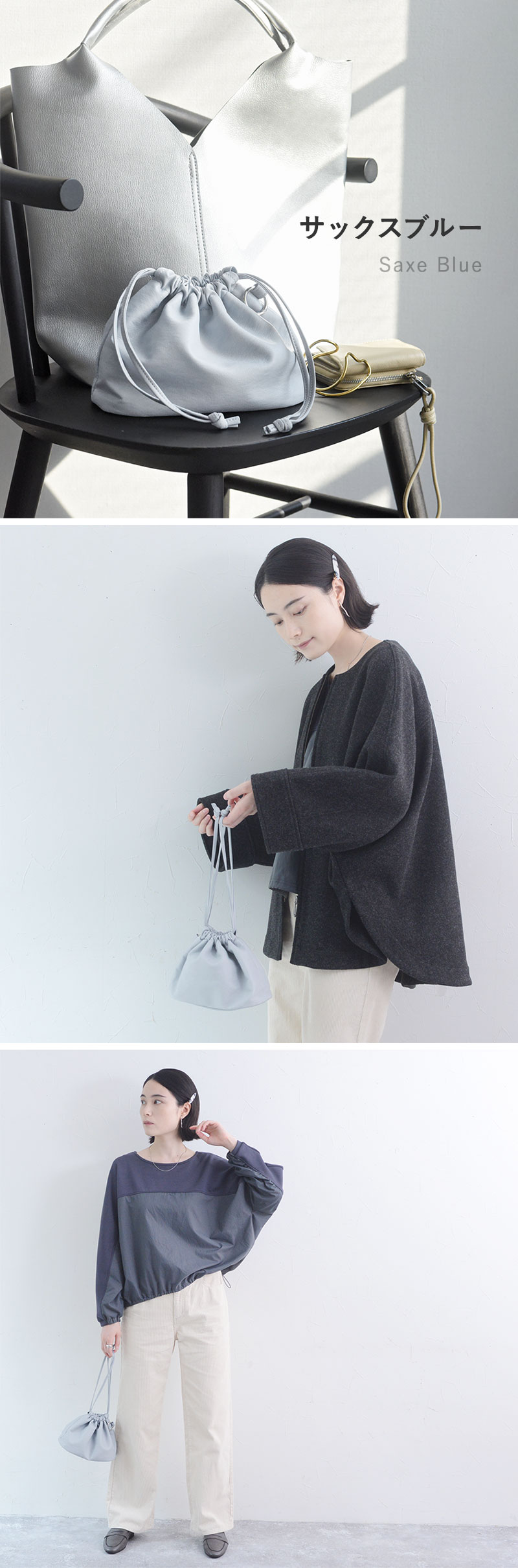 ライトグレーに近いような、くすんだサックスブルー。差し色ながらコーデに馴染みやすいカラーです。