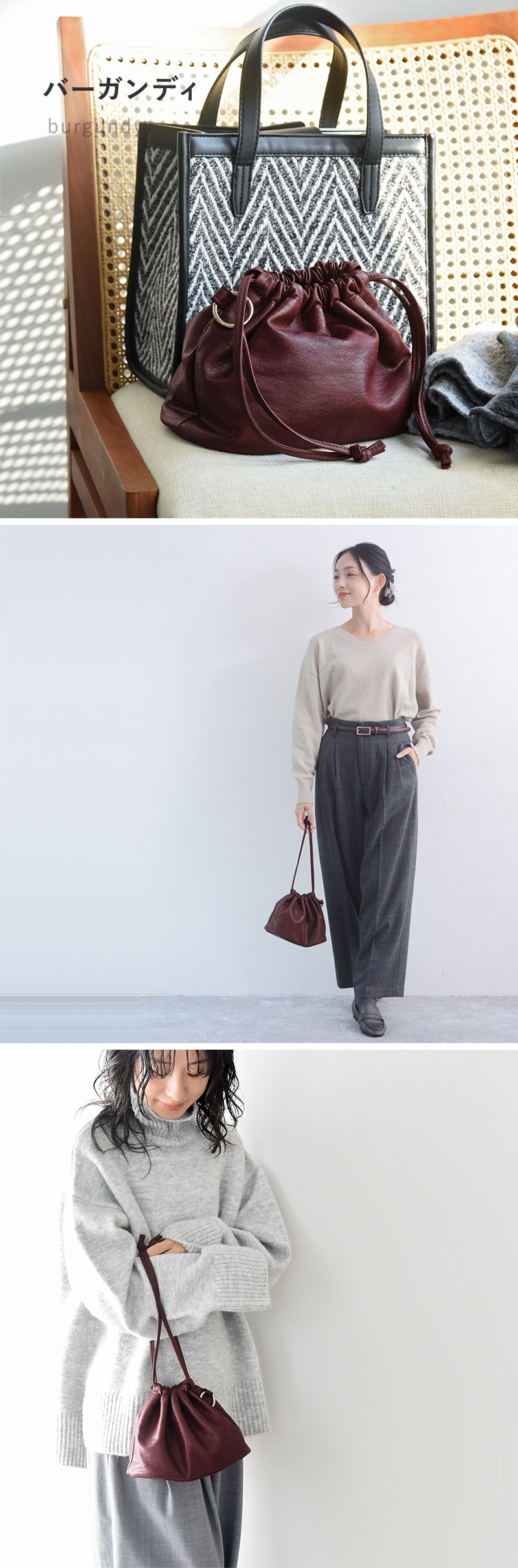 紫がかった濃くて落ち着いた赤色。持つだけでコーデがグッと秋冬らしくなります。