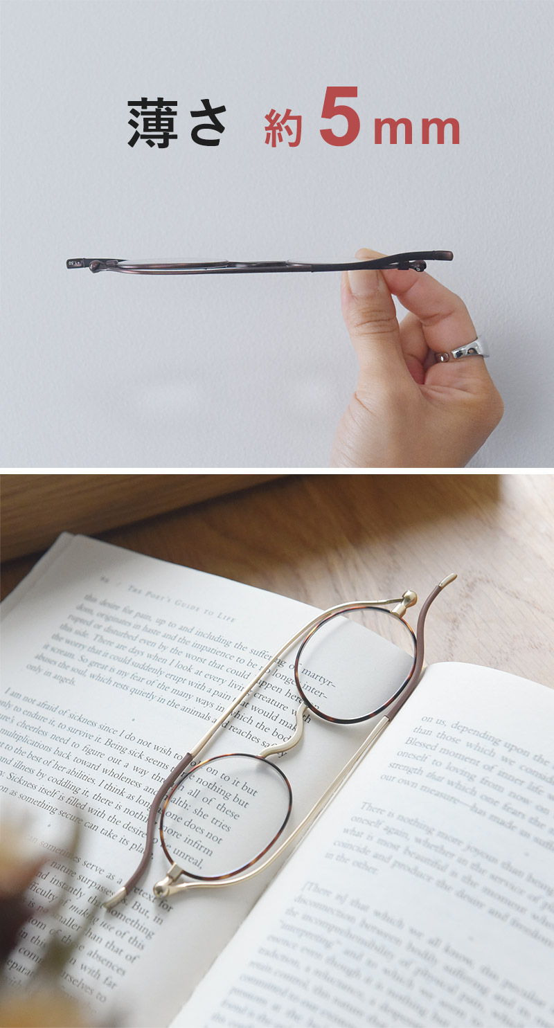 しおりのように薄く折り畳めるリーディンググラスですが、その秘密はメーカーオリジナルの蝶番仕様。特許取得済みの技術で、一般的なメガネとは違い、レンズの上下にツルを畳むことができるんです。
