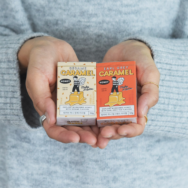 韓国生まれのハチミツ専門ブランド「WORKERBEE(ワーカビー)」のキャラメルボックスは、バッグに忍ばせておくプチおやつに◎。お仕事中にデスクに置いておいても気分が上がるパッケージデザインです。