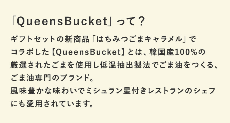 はちみつごまキャラメルは、WORKERBEEの新商品。韓国のごま油ブランド「QueensBucket」とコラボレーションで誕生した一品です。韓国産のごまやはちみつを使用し、ごまの香ばしい風味と繊細な甘さ、はちみつの甘みが口いっぱいに広がります。