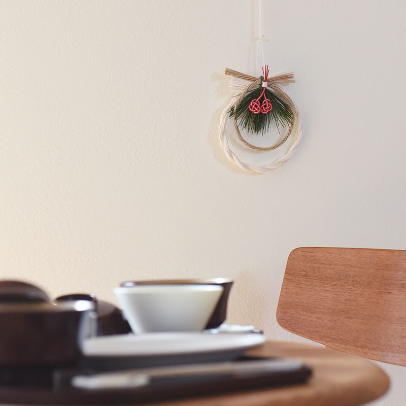 藁ではなく水引で結ばれたしめ縄飾りは、和室だけでなく、ナチュラルなインテリアともマッチ。
