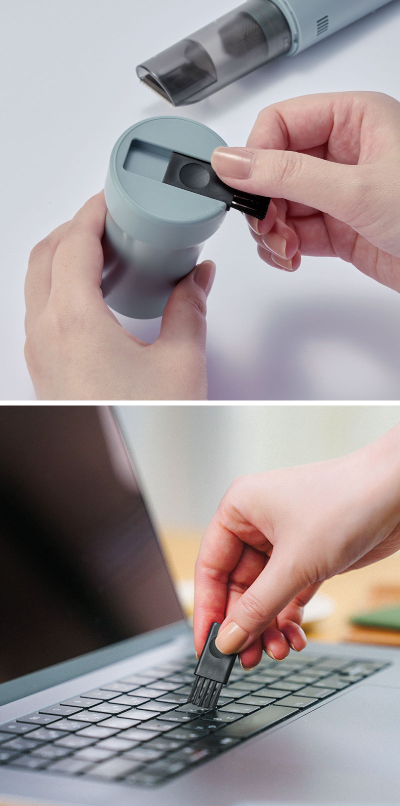 キャップ裏にキーボードなどの汚れをかきだせるブラシが付いています。こまかな汚れが溜まりがちな場所のお掃除もこれでラクチンに。