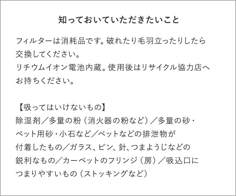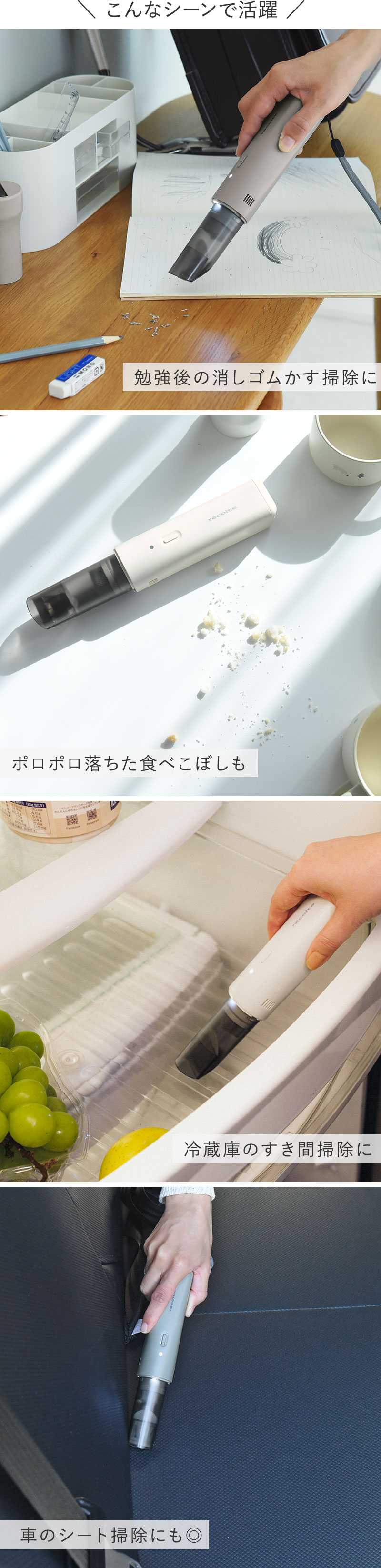 手が届く場所に置くのも、壁掛けしておくのも◎。大きい掃除機を出すほどじゃない、そんな時に重宝するアイテムです。
