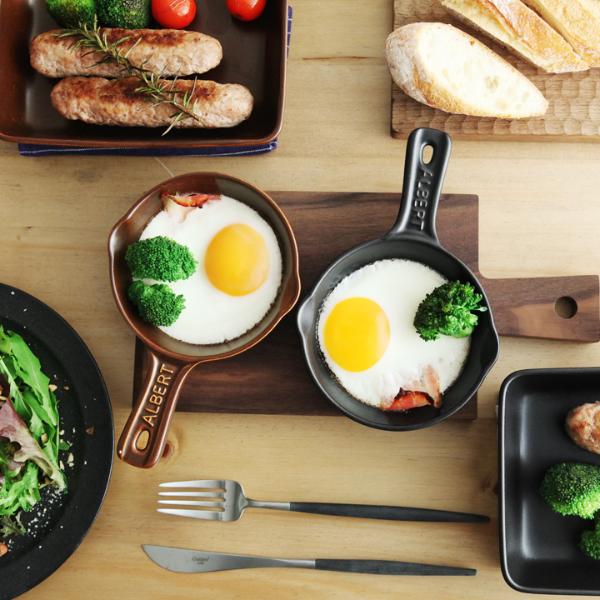 目玉焼きサイズの小さなエッグパン。直火以外にも、魚焼きグリルでの調理や、オーブン料理、電子レンジでのあたため直しもOKです。