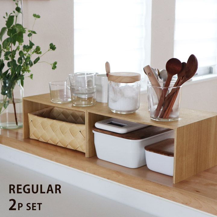 木目調だから、天然木のキッチンカウンターにもよく馴染んでいるプラスラック。
