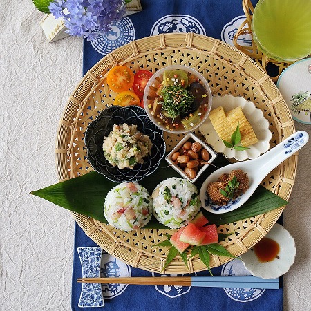 この日は、清涼感のある竹ザルにお気に入りの豆皿を並べて和ンプレートごはん。(冒頭写真)