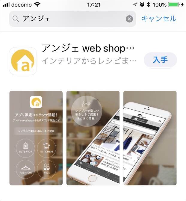 アプリストアで「アンジェ」で検索すると、「アンジェ」のアプリが表示されます。