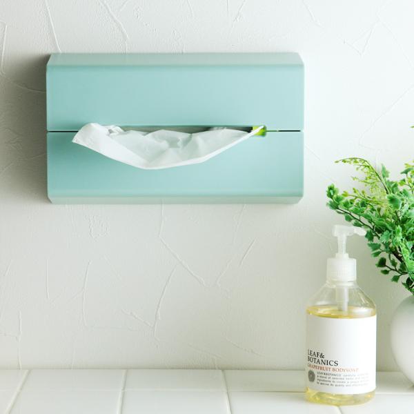 壁に付けられるティッシュケース。限られた収納スペースにティッシュをシンプルに収納可能。