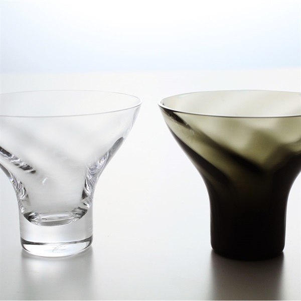 「Sghr(菅原工芸硝子)」ねじりながら吹き上げる難しい職人技で作られた、流れるフォルムが美しいお猪口。透明感のあるクリアとシックなカーボンの2色セット。