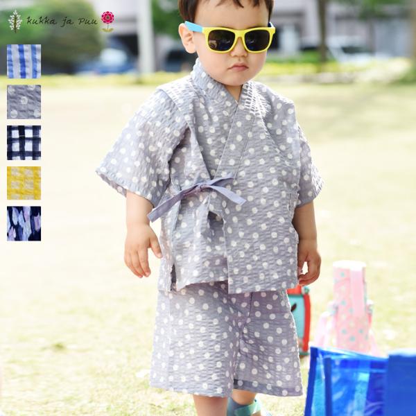 クッカヤプーのキッズ甚平は、ほんのりモダンな北欧テキスタイル風デザイン。ストライプ、ドット、チェックなど、どれも甘さをおさえた大人っぽい仕上がりで、特別な夏を演出します。