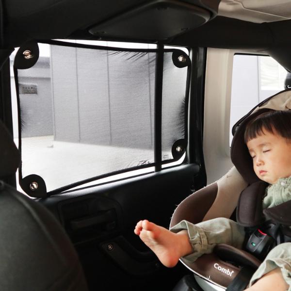 最大1.5倍の伸縮性で窓に合わせられる、後部座席用サンシェード。日差しの暑さ、眩しさからお子様を守ります。光を遮りながら景色を楽しむこともできてベビーも快適。