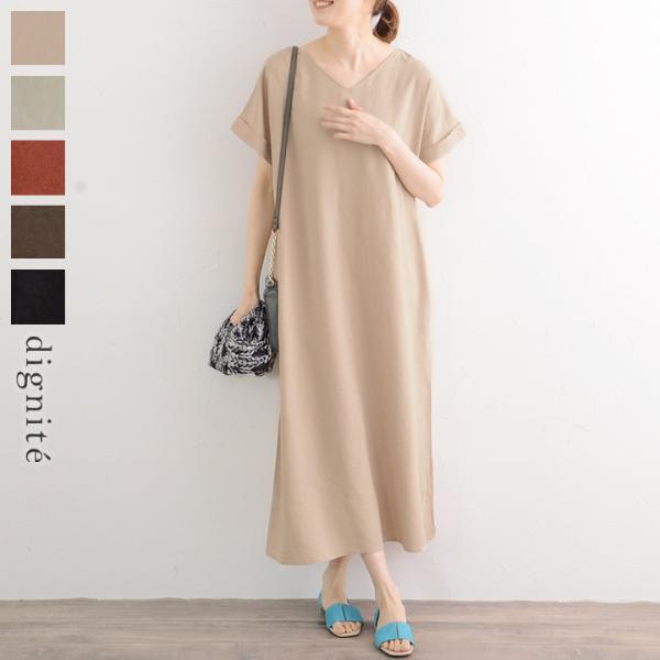 ・ワンピース/リネン混 Vネック ワンピース(ブラック)