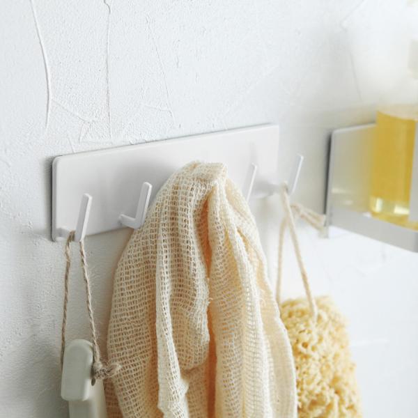 お風呂の壁に貼り付けて使ってもサビにくい、マグネットシートを使用したバスルーム5連フック。お掃除道具も収納できます。