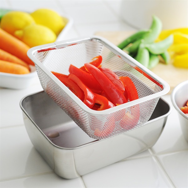 食材の下ごしらえや一時置きにちょうどいいサイズのスタッキングザルと角バットのセット。